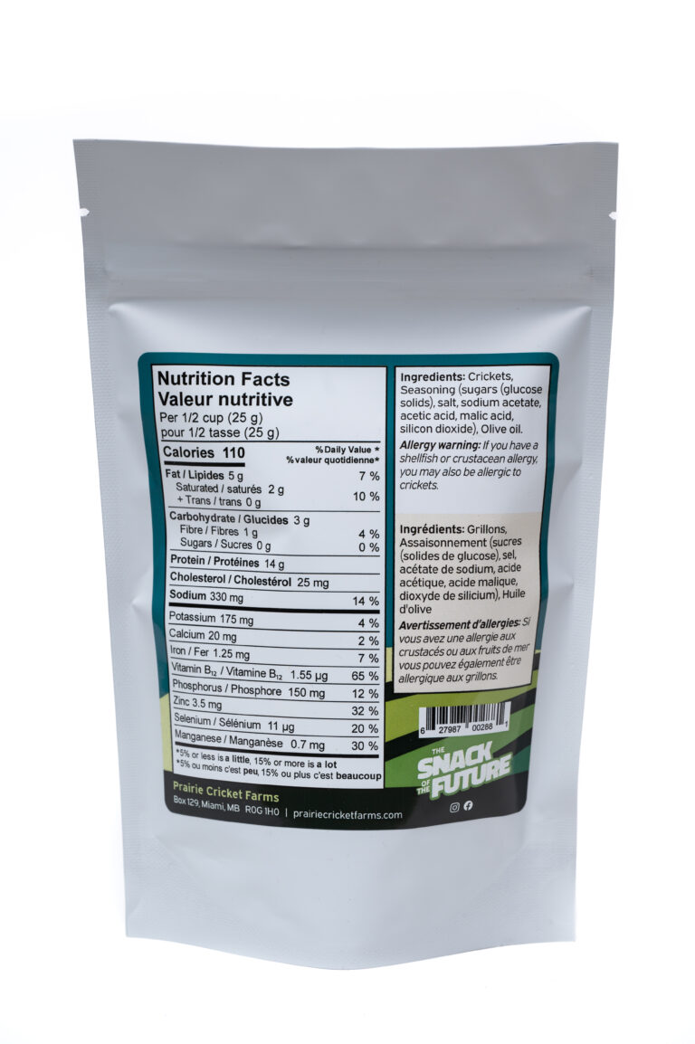 Ingredients: Crickets, Seasoning (sugars (glucose solids), salt, sodium acetate, acetic acid, malic acid, silicon dioxide), Olive oil.