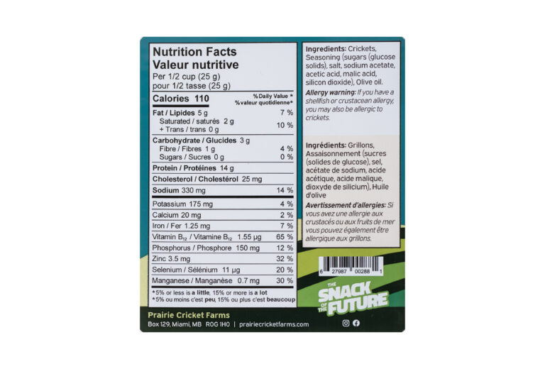 Ingrédients: Grillons, Assaisonnement (sucres (solides de glucose), sel, acétate de sodium, acide acétique, acide malique, dioxyde de silicium, Huile d’olive.